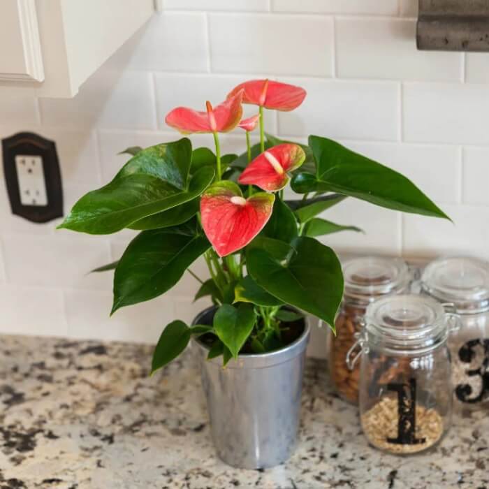 Anthurium offers glossy red, pink, or white spathes that show up in cycles all year. It looks bold but behaves gently indoors, especially in humid rooms.
