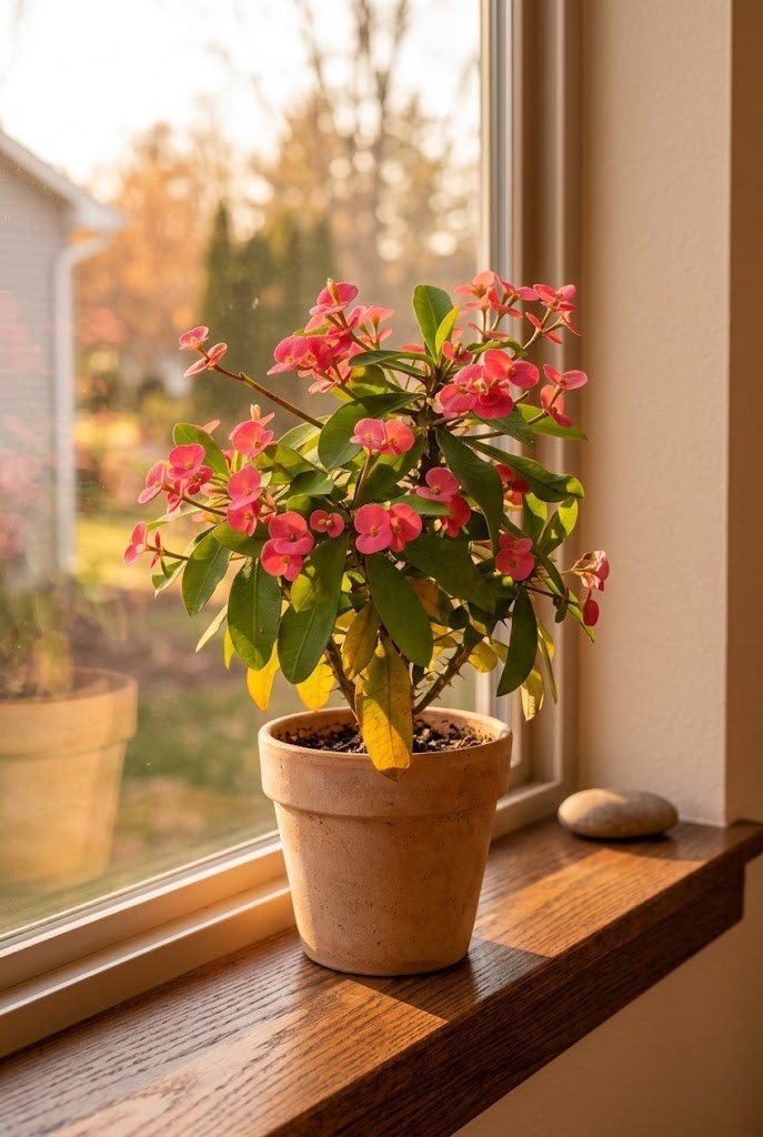 This one blooms like it has a secret agenda—in the best way. In a sunny window, crown-of-thorns throws out tiny flowers so often it feels like it never really stops.