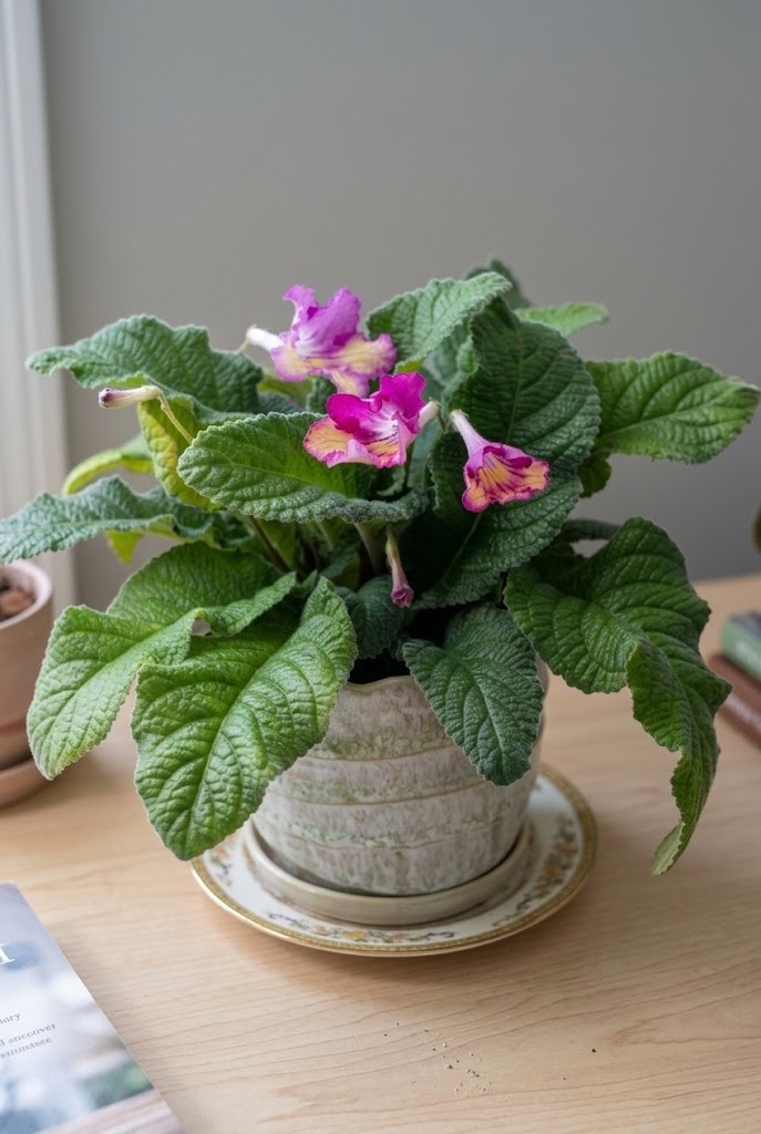 Streptocarpus looks like a little bouquet that decided to live in a pot—soft leaves low to the soil, with fluttery blooms rising above on thin stems.