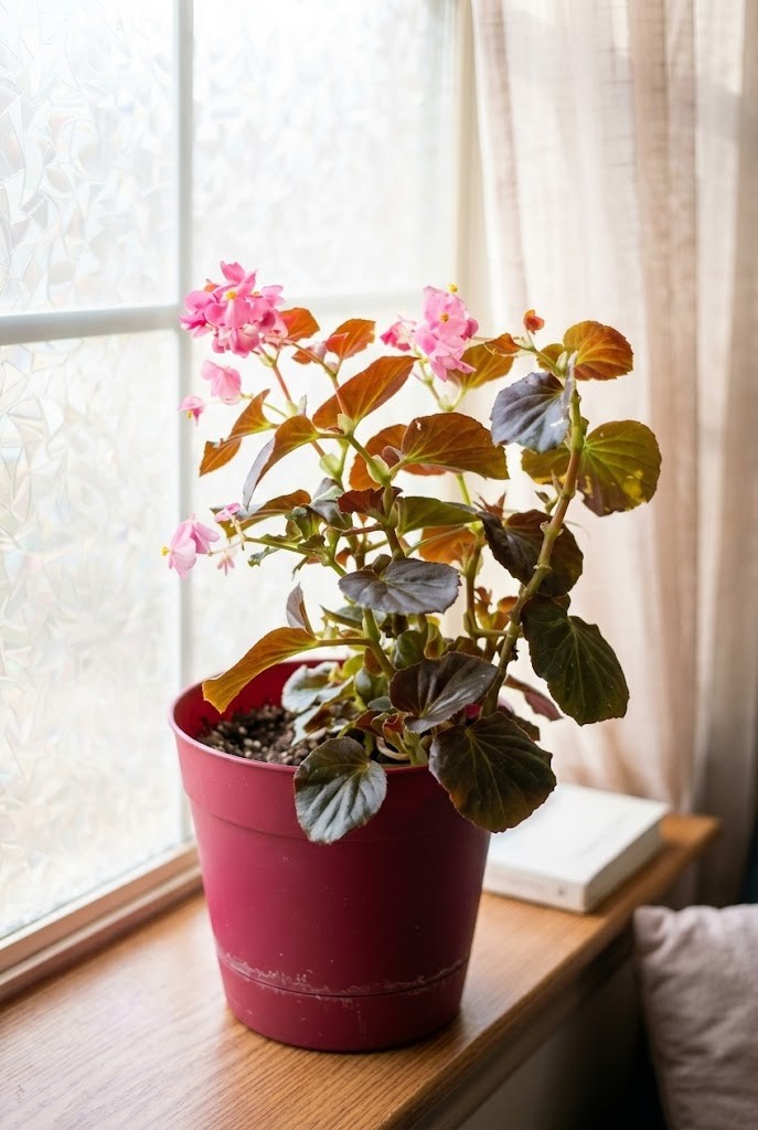 For the easiest indoor wins, keep it in bright, filtered light on a windowsill or a shelf a foot back from the glass. Let the top inch of soil dry before watering again—steady moisture is good, but soggy soil is where begonias start sulking fast.
