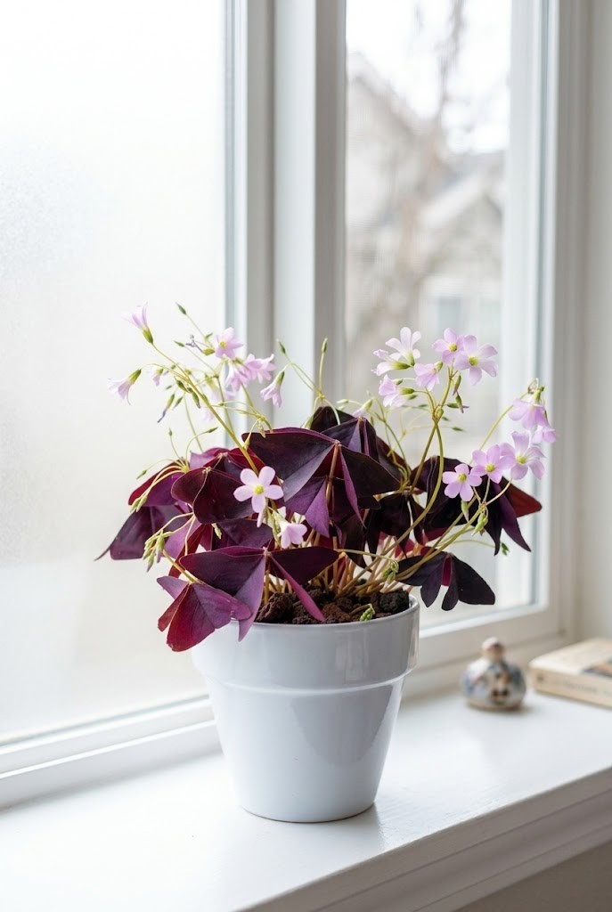 Purple shamrock is one of those plants that looks styled even when you do nothing—deep purple, butterfly-like leaves that open in the day and fold up at night, plus small white or pink blooms that pop up in frequent cycles.