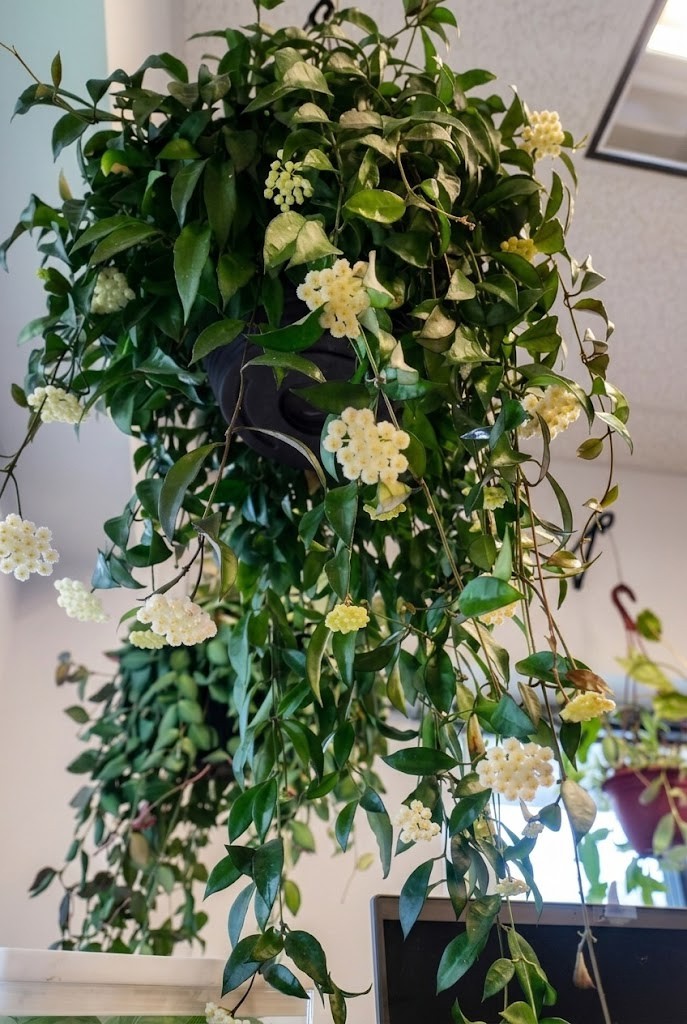 A hoya looks clean and sculptural—thick, waxy leaves on trailing vines, with clusters of starry blooms that feel almost unreal up close.