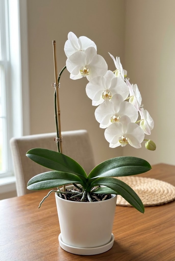A phalaenopsis orchid looks like a finished centerpiece, perfect for a dining table or high tabletop where your dog can’t reach. It’s the easiest way to add nice without adding chaos.