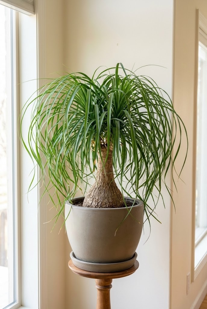 Ponytail palm has a playful fountain shape. The thick base makes it feel stable, and it looks great beside a console or in a corner near a window.