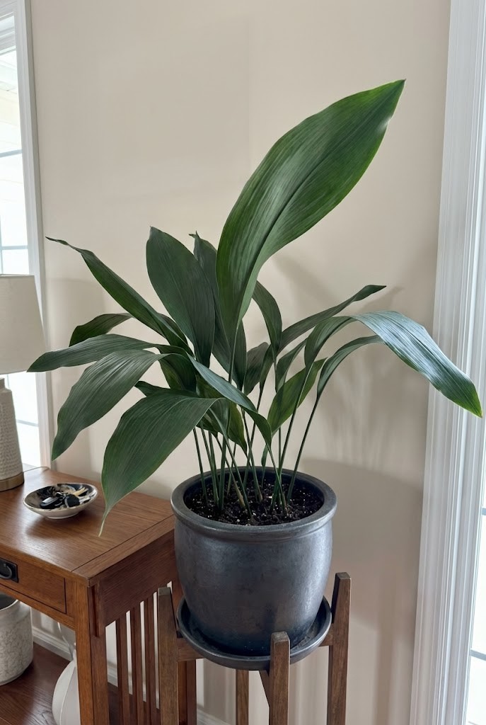 Cast iron plant is the quiet tough one. Deep green leaves look clean in an entryway area near leashes and bowls, especially on a stand that keeps it off the floor but still grounded.