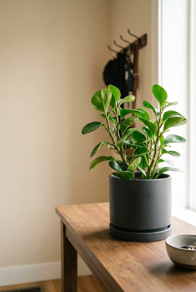Baby rubber plant stays compact and polished, with thick glossy leaves that look great on a desk shelf or narrow console. It’s one of the easiest small plants to keep looking neat.