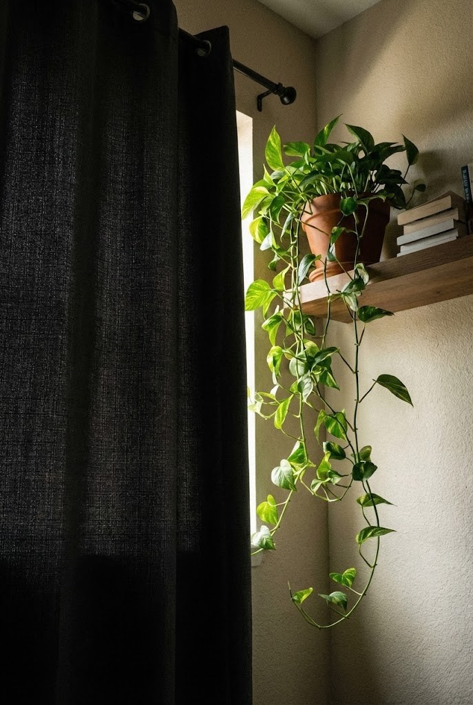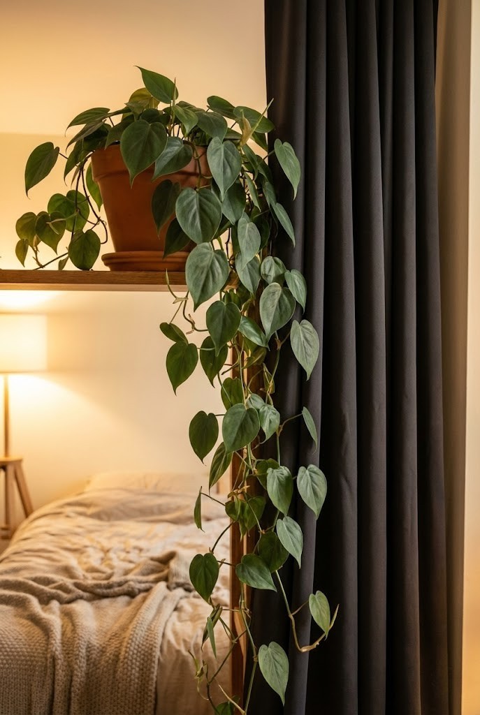 Pothos is often chosen for minimalist bedrooms because of how it drapes. Its vines fall gently over shelves or furniture edges, softening straight lines from curtains and walls.