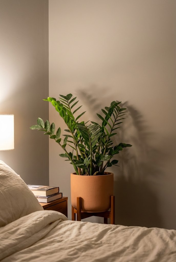 Bedroom corners away from windows are often the darkest spots in the room. Light here is warm but weak, and plants need to stay visually steady without reaching, shedding, or demanding attention.