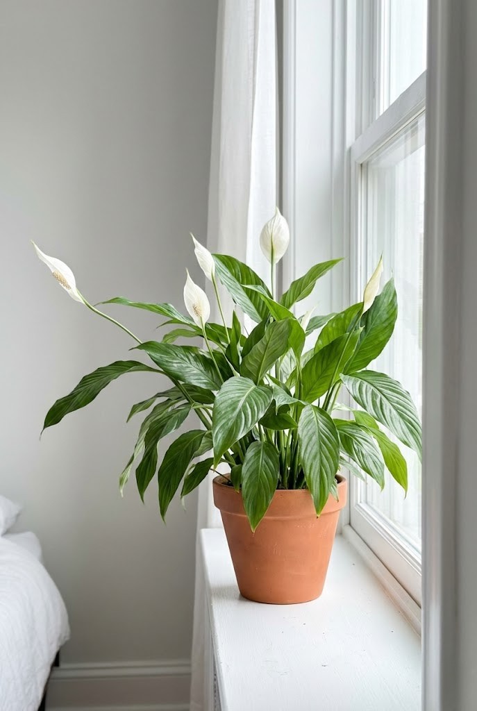 Peace lilies soften muted bedroom light with broad, deep green leaves. In north-facing rooms, they hold their color and shape without needing direct sun.