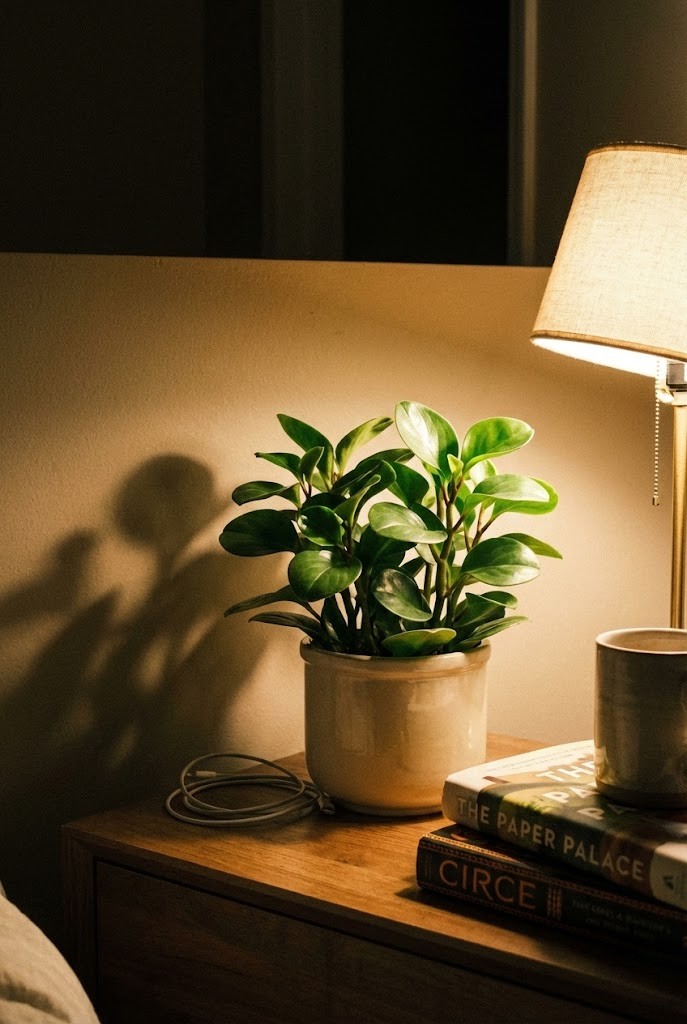 [📸 INSERT IMAGE: bedroom corner far from window, warm bedside lamp, plant placed on floor]