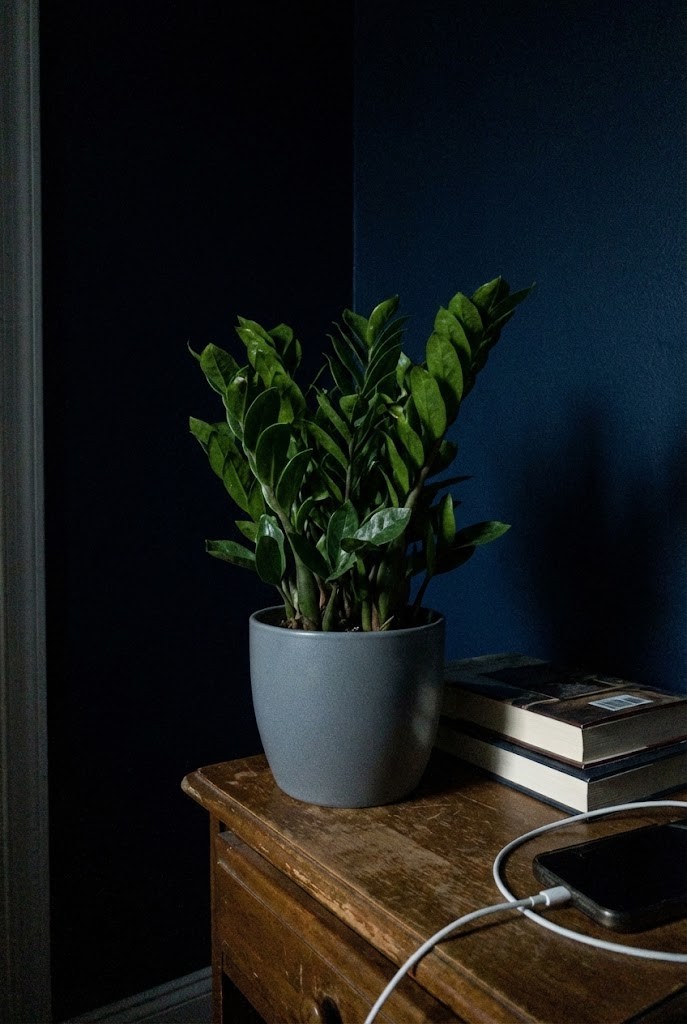 ZZ plants handle low light with very little reaction. Their thick, upright leaves store moisture and hold their shape even when light comes only from a bedside lamp.