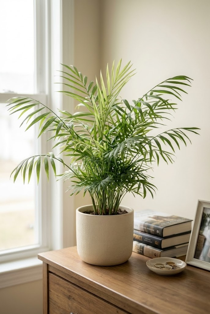 Parlor palms bring a soft, hotel-like feel to bedrooms. Their fine fronds gently soften furniture lines without creating visual noise.