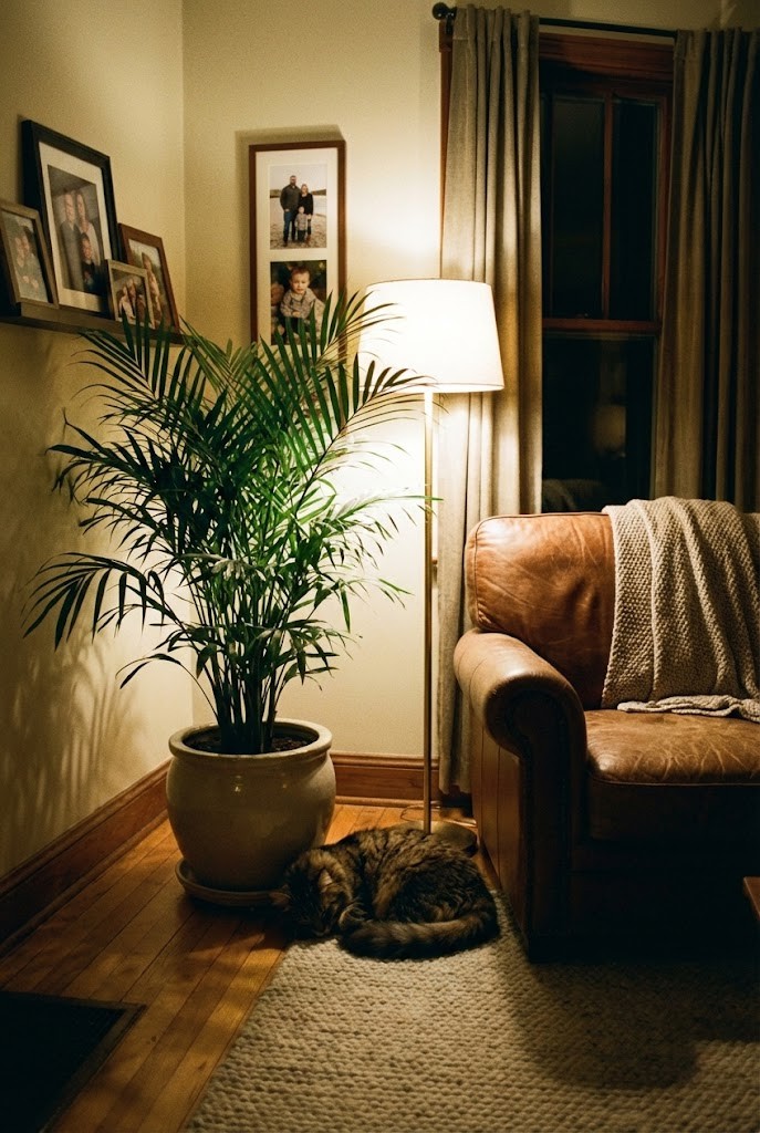 Some corners never get daylight at all — they only look alive when a lamp turns on in the evening. If your cat likes to nap in that same spot, the plant you choose has to feel established, not delicate.