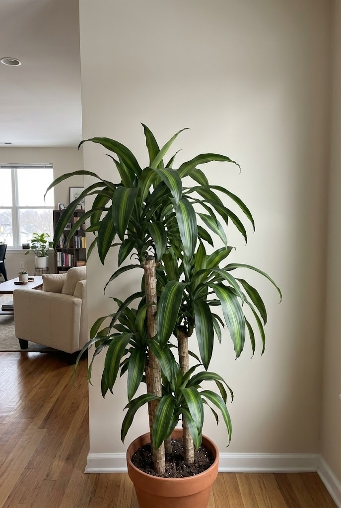 Corn plants bring classic, tree-like height into larger rooms. Their thick canes and arching leaves give them presence without requiring bright light.