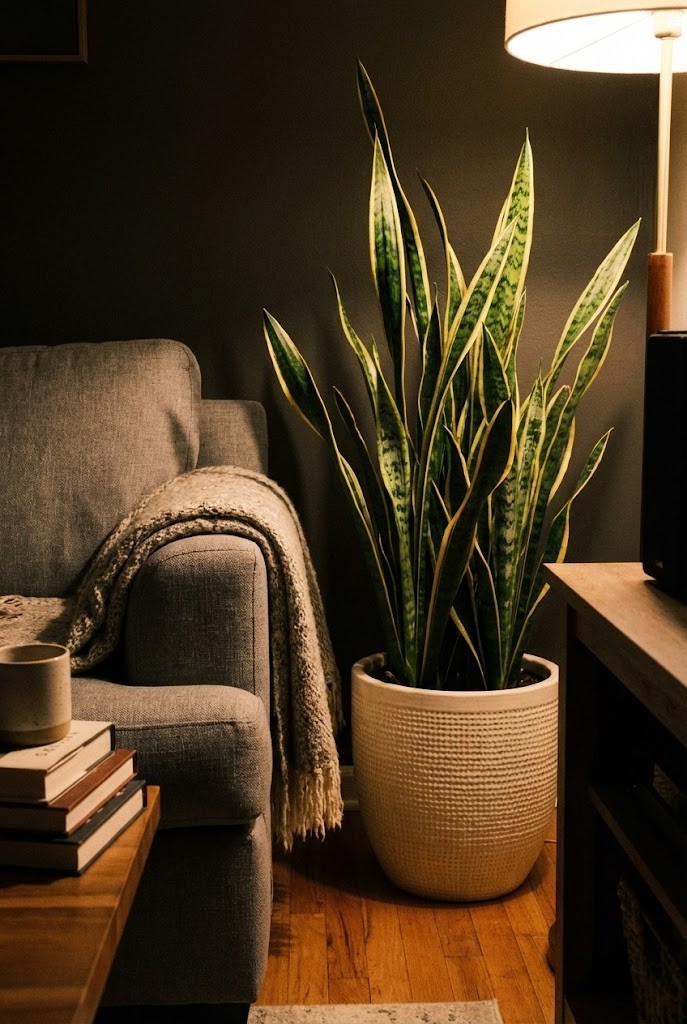 In a living room corner, a tall snake plant feels architectural rather than decorative. It’s especially useful when you want height without spreading width into walkways.