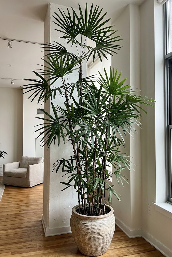 Lady palms are well suited to open-plan spaces because they create height without looking sparse. Their clustered stems form a dense, upright shape that reads clearly under ceiling lights.