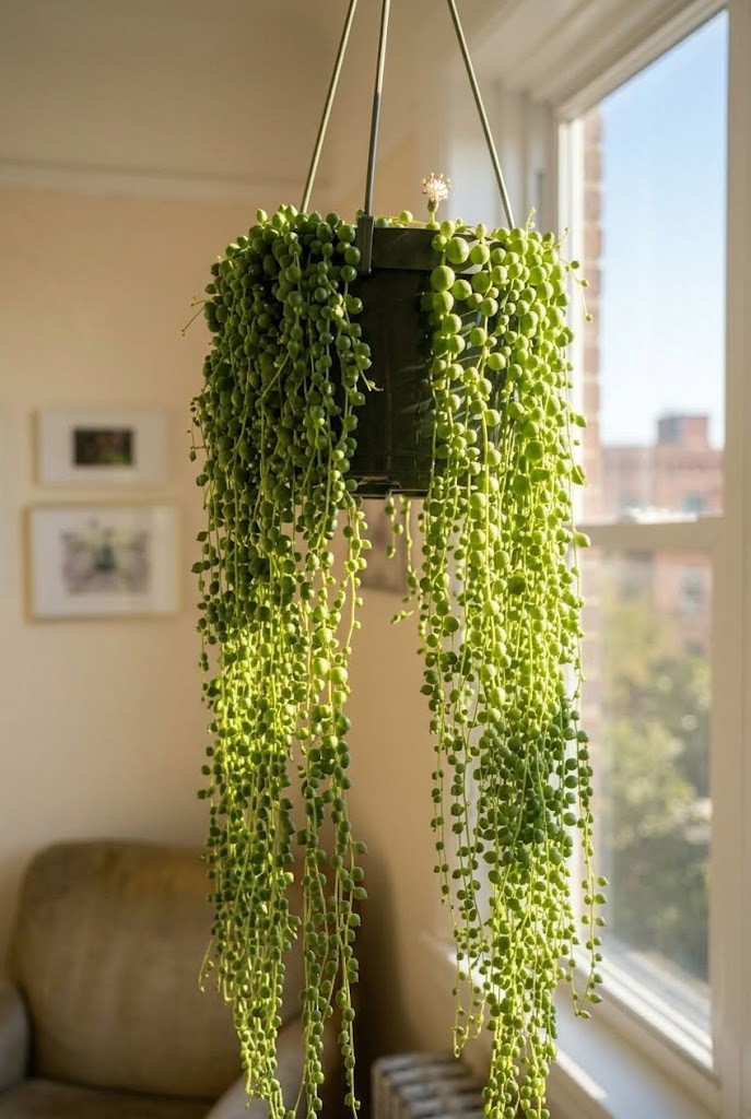 Let the soil dry out fully, then water thoroughly. If the pearls go mushy, it’s too wet; if they shrivel, it waited too long. And yes, keep it away from pets that nibble first and ask questions never.