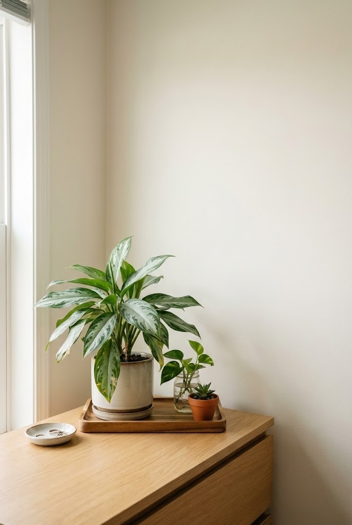 Chinese evergreen is the definition of “styled but unbothered”: patterned leaves, compact shape, and a tidy look that makes dressers and shelves feel curated.