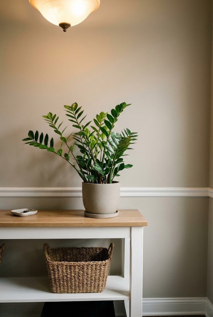 A ZZ plant looks glossy and modern — thick stems, waxy leaves, and a shape that stays neat even when life gets busy.