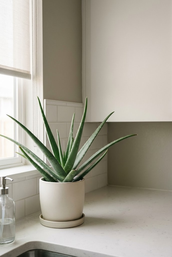 Aloe looks like a living sculpture — a clean rosette of spiky leaves that makes any tray or countertop feel intentional.