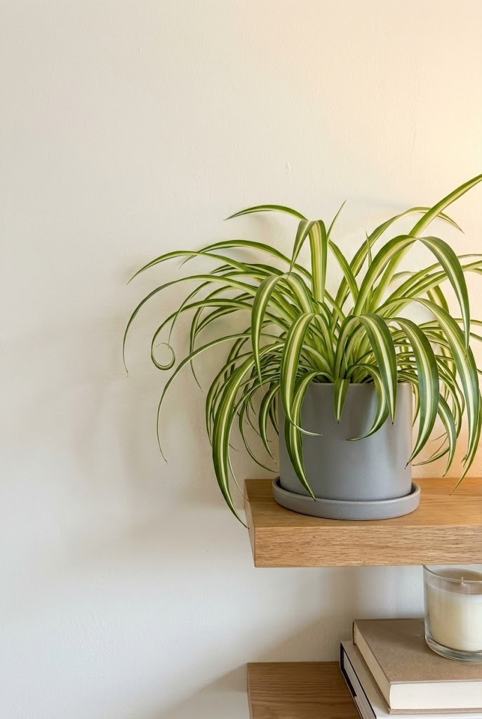 A spider plant spills outward like a fountain — soft, slightly wild, and perfect for making a space feel lived-in instead of staged.