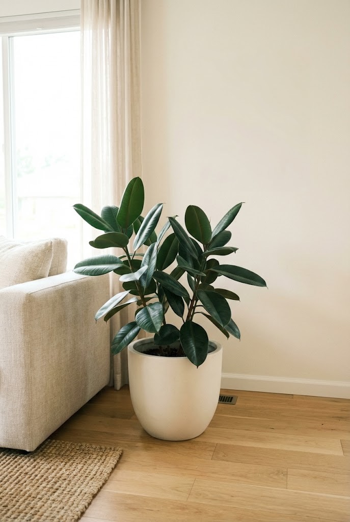 Rubber plant leaves look almost lacquered — thick, glossy, and architectural against white walls and baseboards.