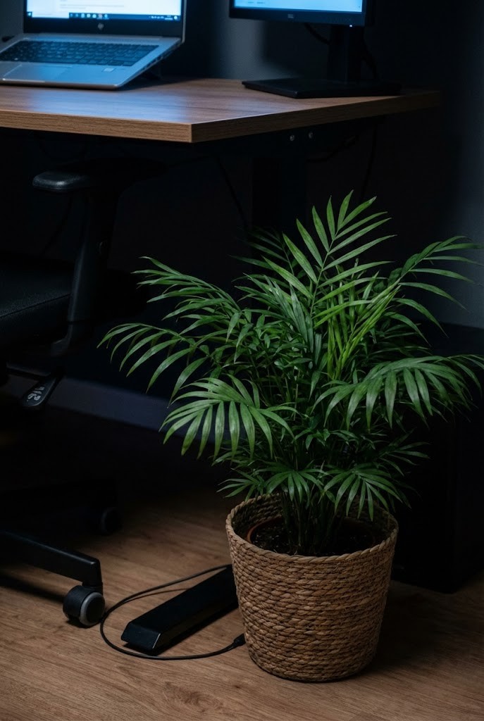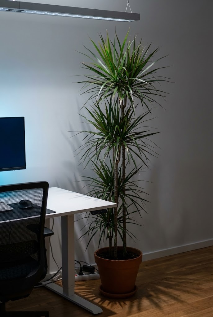 Dracaena adds height next to a desk without crowding the workspace. Its narrow form keeps the area feeling open even in low light.