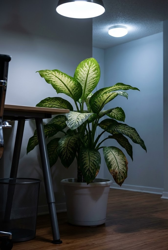Dieffenbachia brings broader leaves into interior spaces, breaking up the visual monotony of desks and shelving.