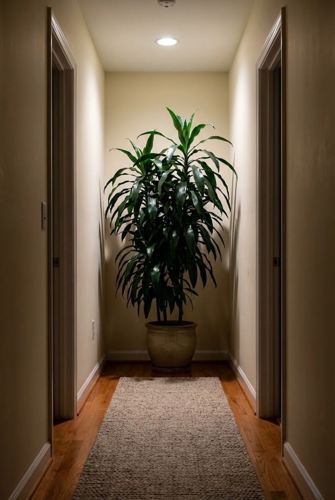 Janet Craig dracaena works well in narrow spaces because of its clean, upright growth. It adds height without narrowing the walking path.
