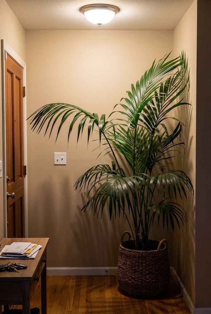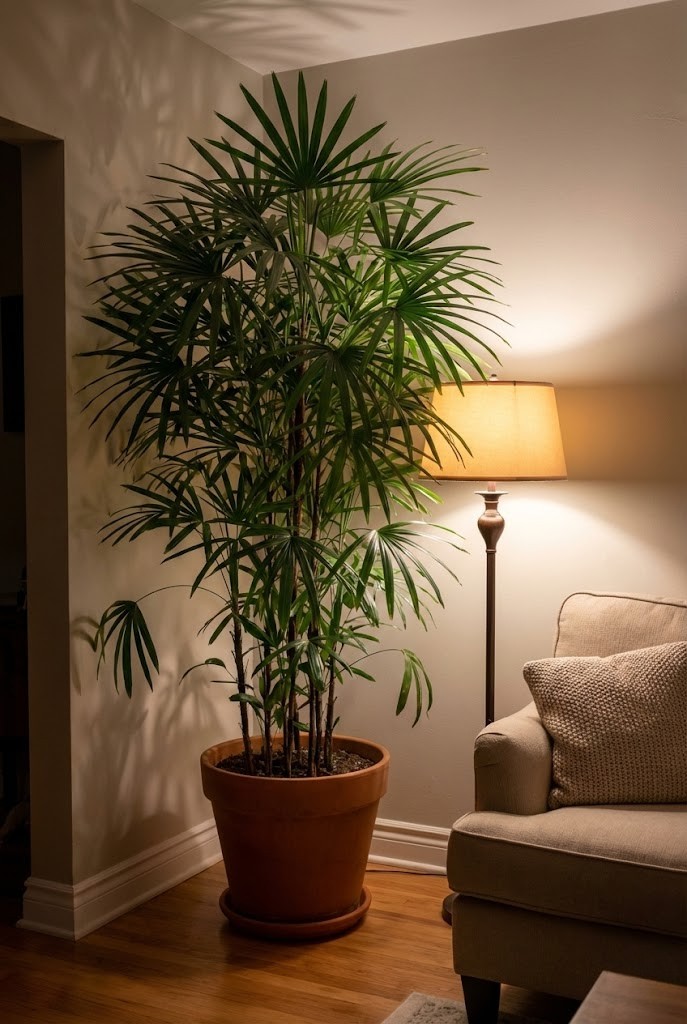 A lady palm adds quiet elegance to darker corners. Its clustered stems soften hard angles and bring height without feeling sparse.
