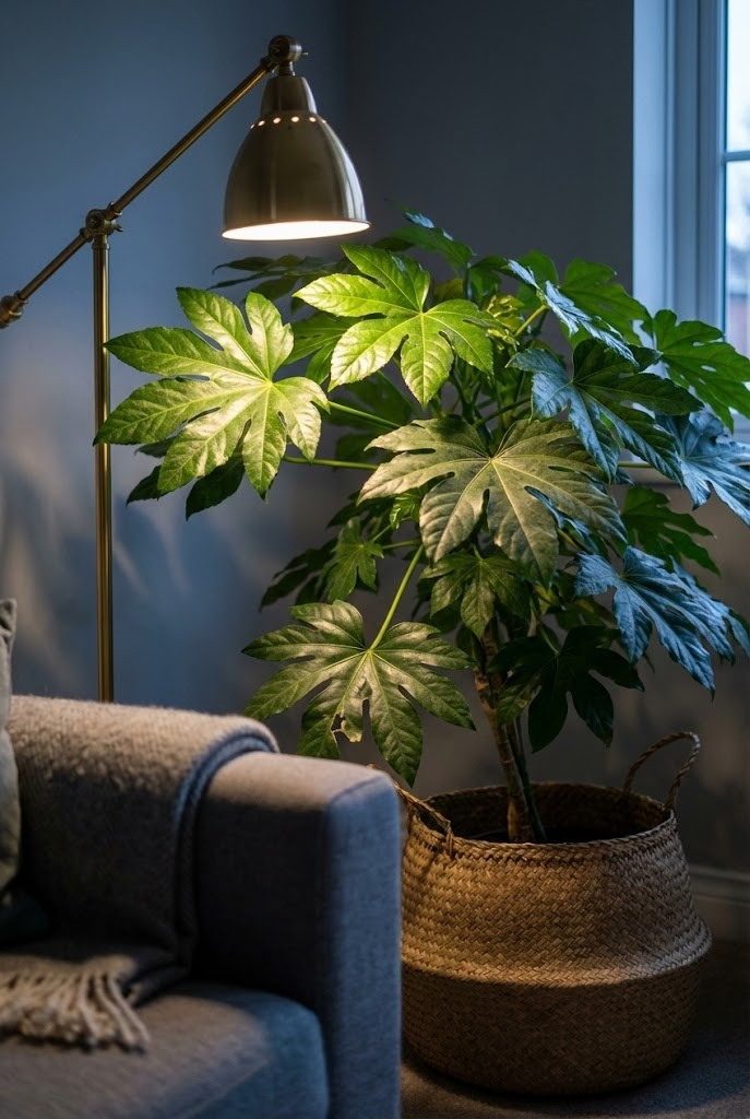 Fatsia japonica brings bold structure to low-light corners. Its large leaves remain readable even when light levels are low.