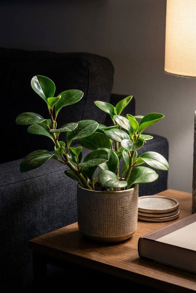 Peperomia obtusifolia works well as a finishing touch in low-light corners. Its compact form fits easily on side tables or low stands.