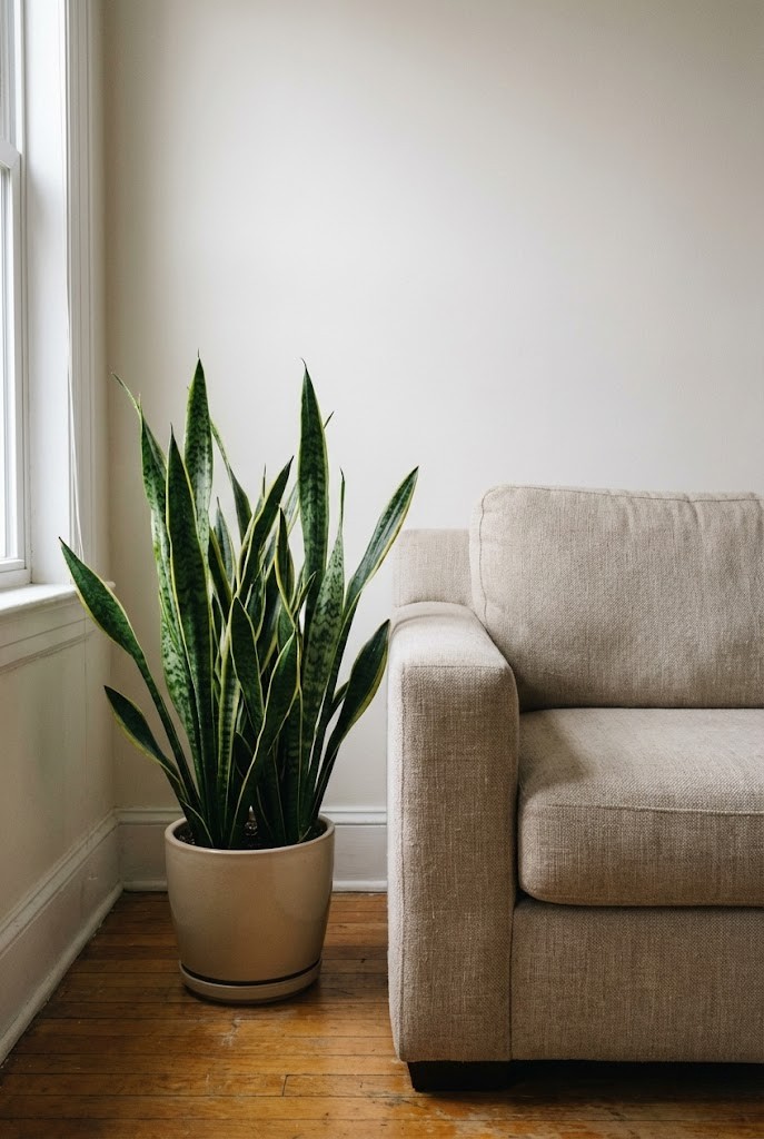 Placed next to a sofa or media console, a snake plant adds vertical structure without feeling delicate. Its upright leaves stay firm even when the plant sits several feet from the window, making it easy to place where brighter plants struggle.