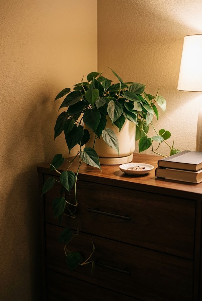 Pothos is one of the easiest trailing plants to live with in low ambient light. It won’t sprint in the dark, but it also won’t collapse — it simply slows down and stays manageable.