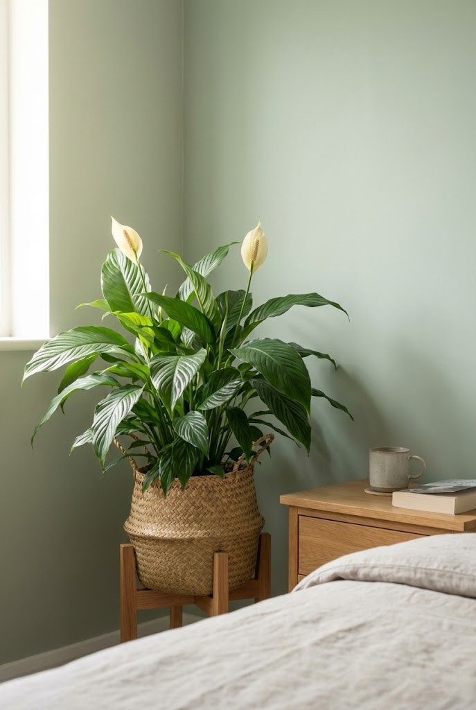 A peace lily brings a gentle, clean presence to low-light bathrooms. Even when it’s not flowering often, the leaves stay lush in soft light — and it tends to appreciate the extra humidity in the air.
