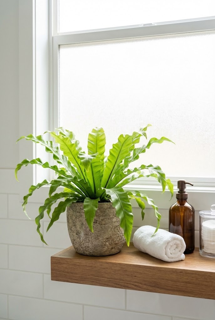 On a bathroom shelf, a bird’s nest fern feels lush without being fussy. Its broad, rippled leaves soften a room dominated by tile and glass.