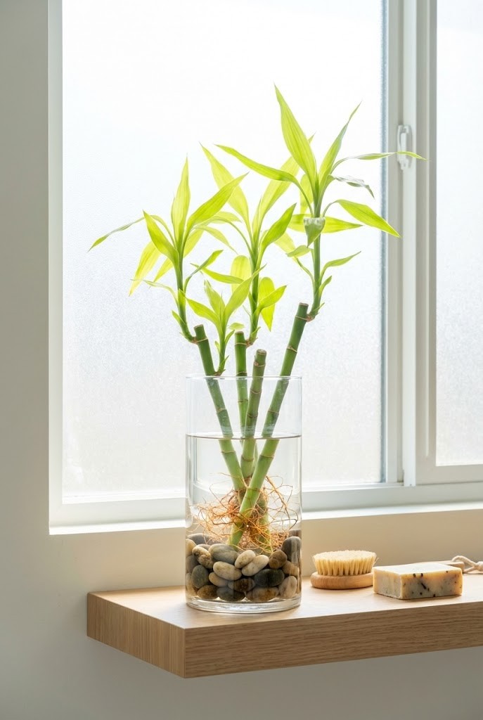Lucky bamboo fits easily into small bathrooms because of its upright form and minimal footprint. On narrow shelves, it reads as intentional rather than decorative filler.