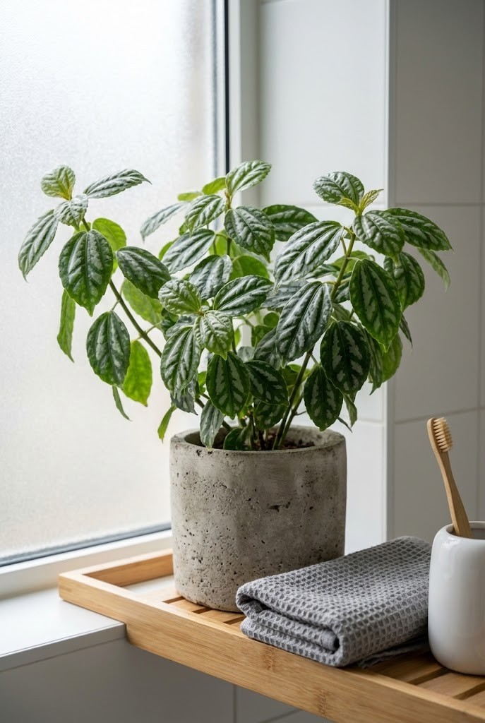 In smaller bathrooms, it looks best a little away from splash zones, so the soil doesn’t stay soggy after showers.