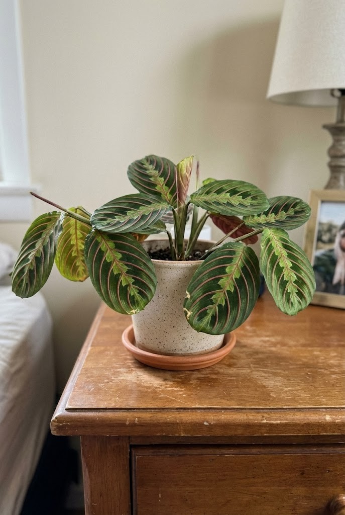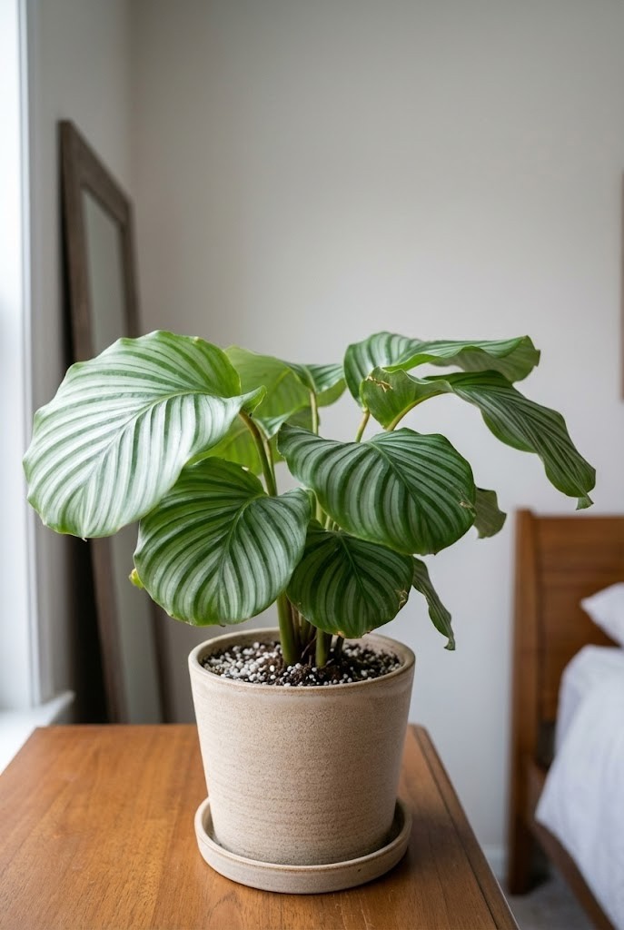 Prayer plant has soft, patterned leaves that look like a living textile. It’s especially pretty on an upper shelf near a window where light is gentle.
