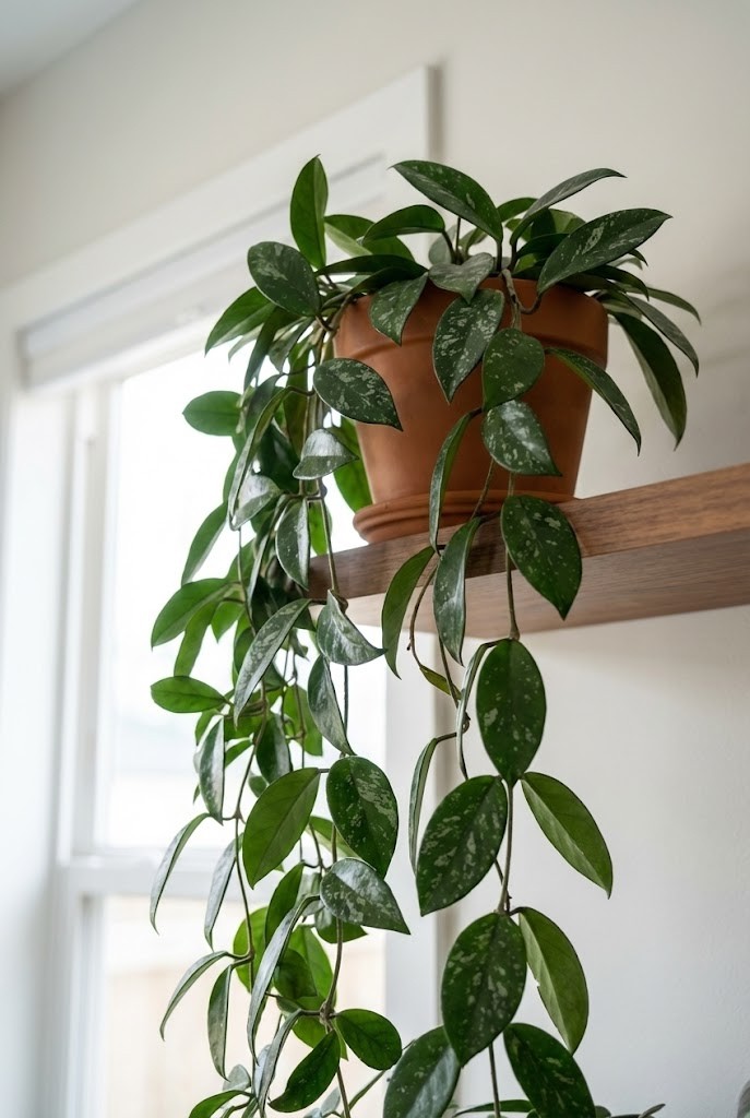 Hoya has thick, waxy leaves and a trailing shape that looks great on a high shelf. It gives you that collected plant feel without being fragile.