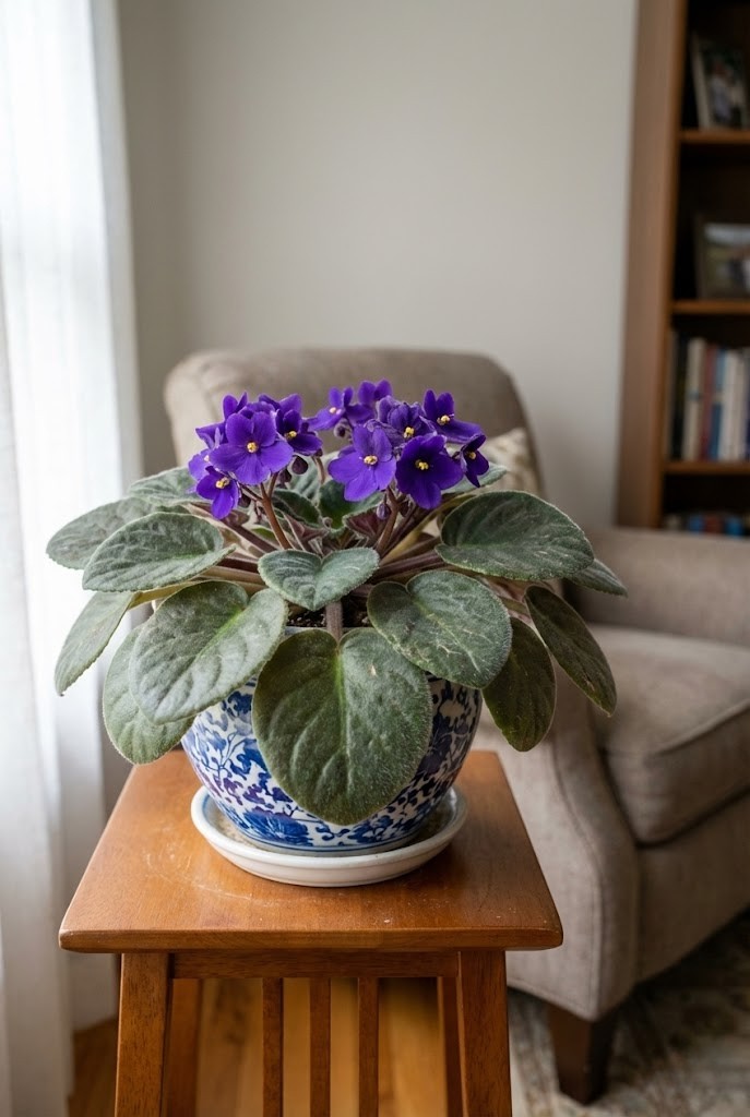 African violets are small and cheerful. They look perfect on a high tabletop or an upper shelf near a window where the light is bright but not direct.