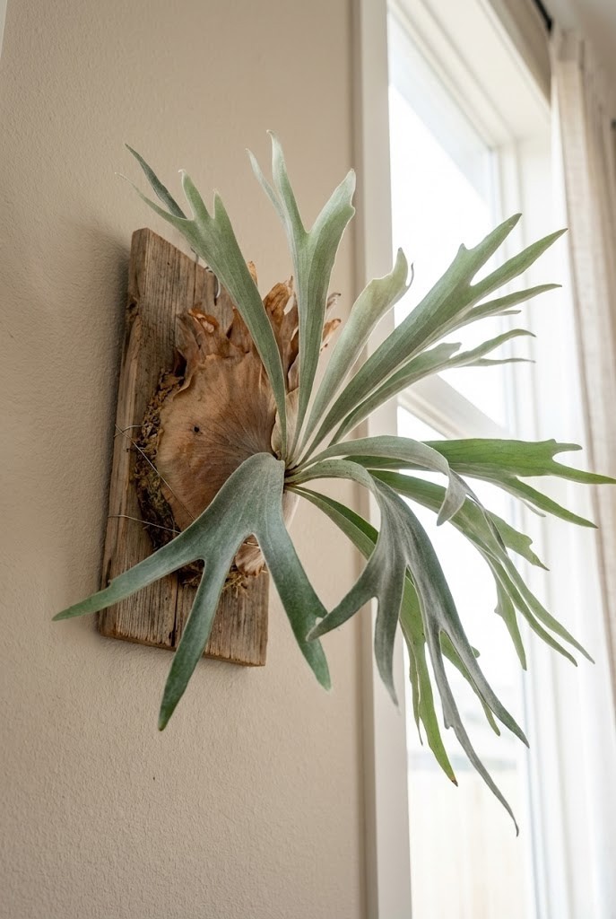 Staghorn fern looks like living wall art. Mounted on a board or set high on a shelf, it adds texture without taking up floor space in pet-heavy rooms.