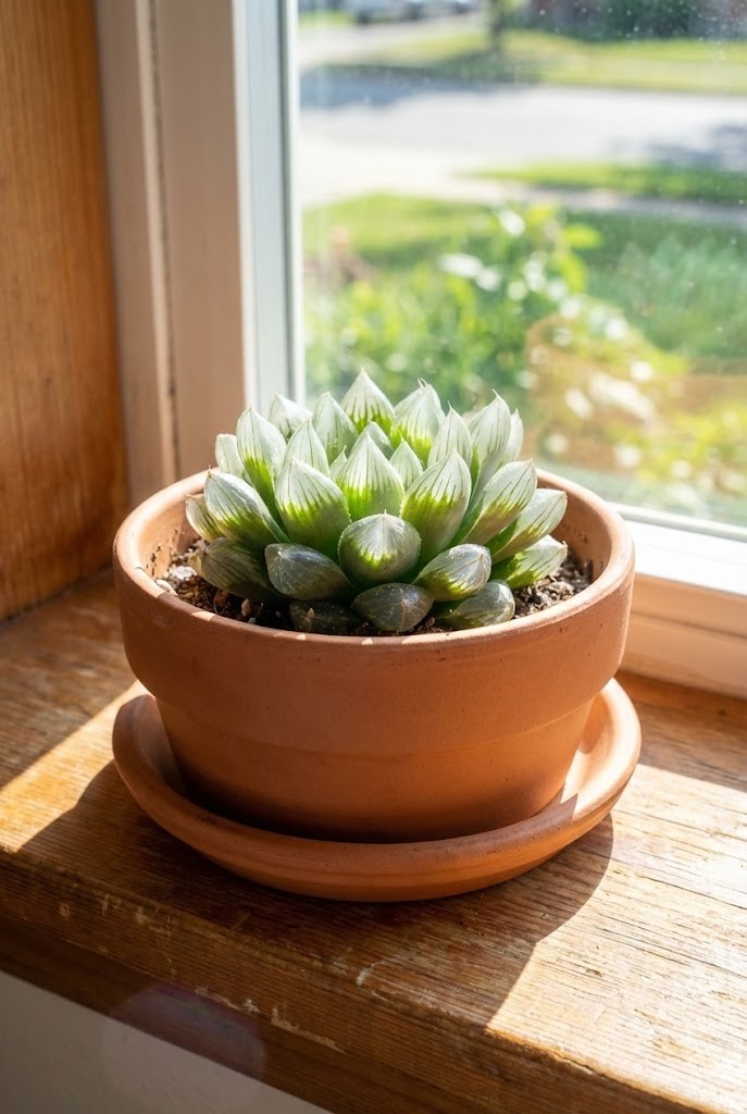 Haworthia is small, sculptural, and perfect for a windowsill. It stays compact, so it’s easy to tuck into a stable planter with a saucer.