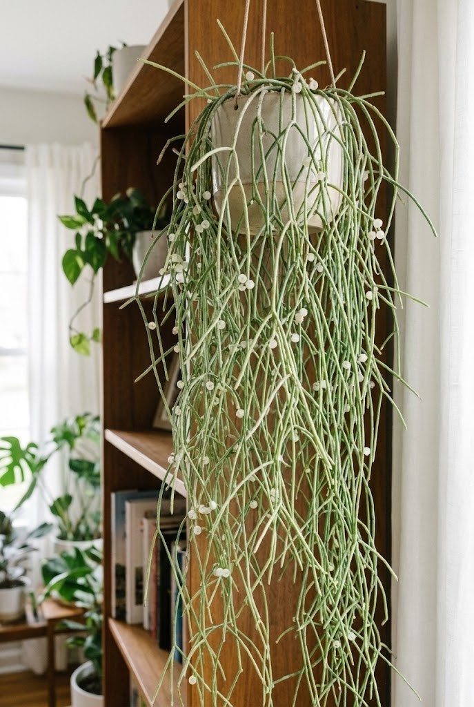 Mistletoe cactus has thin, trailing strands that look cool on a high shelf in a bright room. It gives a modern, sculptural look without sharp spines.