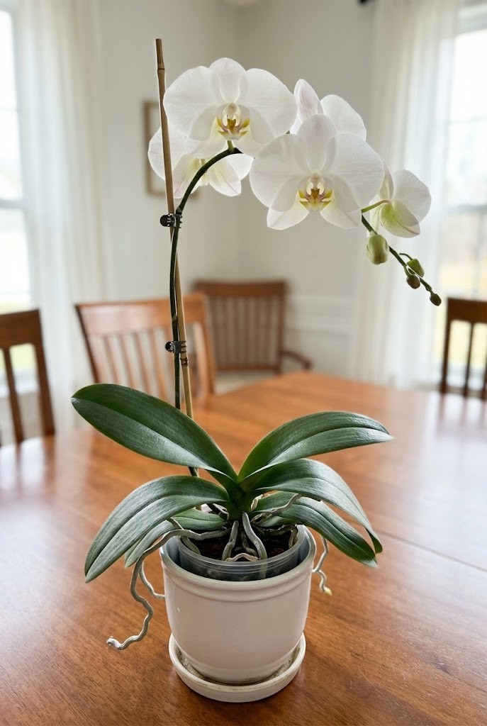 Low-risk note. Orchids like this are widely listed as pet-safe. Water lightly when the potting mix is close to dry, and use a heavier outer pot if you’re worried about tipping.