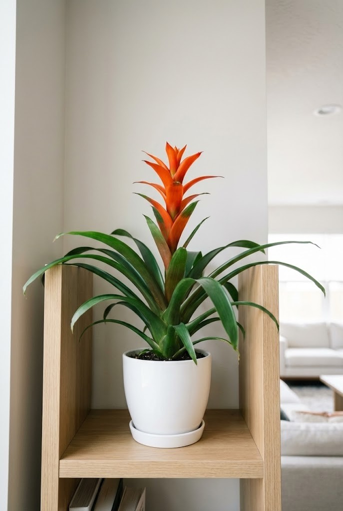 Bromeliads bring instant color with a clean, modern shape. They look great on a shelf near a bright window, especially when you want a pop that still feels tidy.