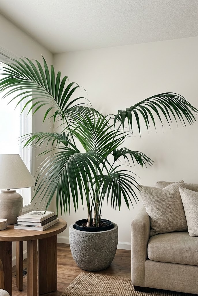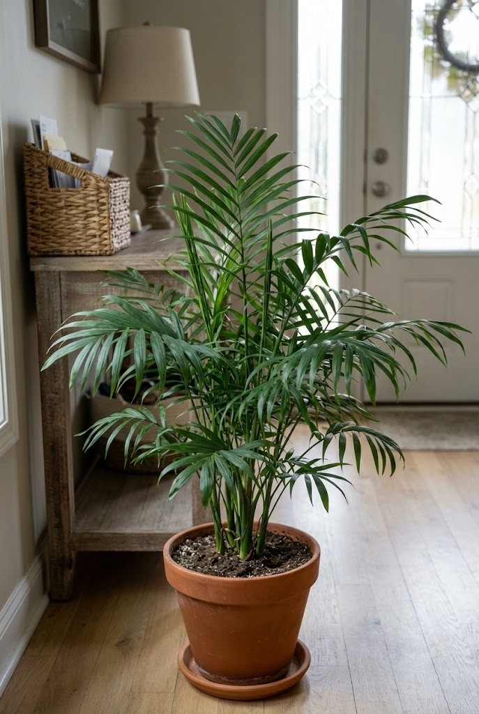 Parlor palm looks calm and classic in a bedroom corner or entryway area. It’s especially nice when you want greenery that doesn’t feel spiky.