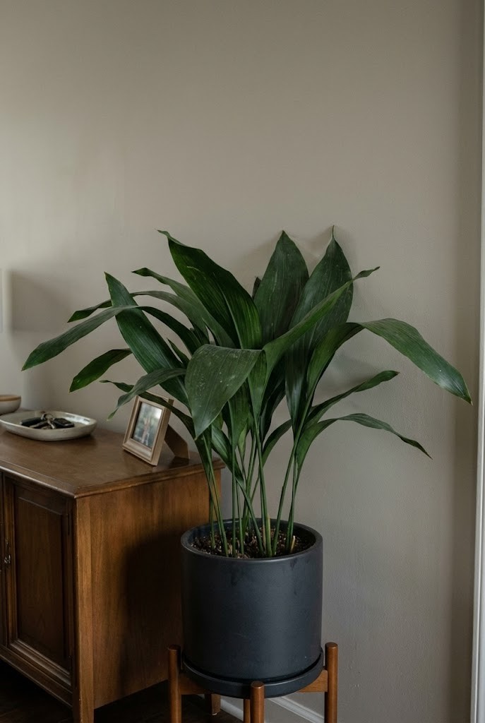 Cast iron plant is the quietly tough option for less-than-perfect light. It looks neat on a low stand near a hallway or entry traffic zone.