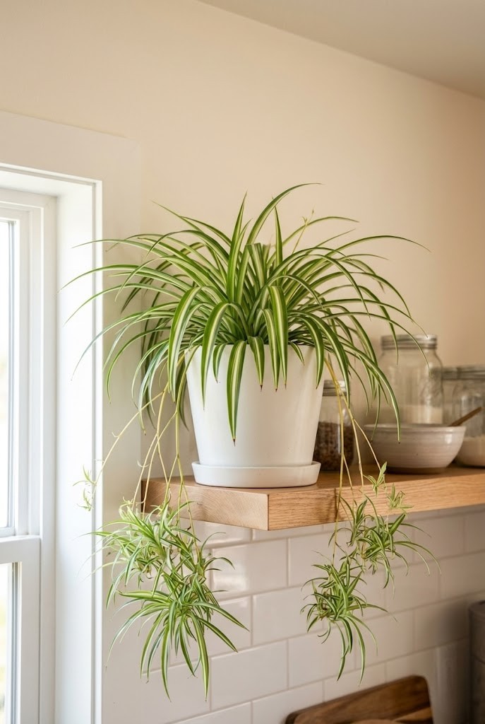 A spider plant looks like a little fountain of leaves on a high shelf or on a kitchen windowsill. When it’s thriving, it sends out baby offshoots that make the whole setup feel lively.