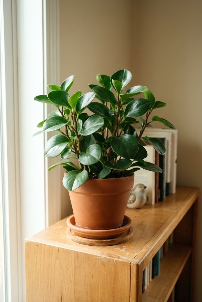 Thick, glossy leaves make this one look polished on an upper shelf near your desk or on a bookcase. It stays compact, so it’s easy to keep tidy in shared spaces.